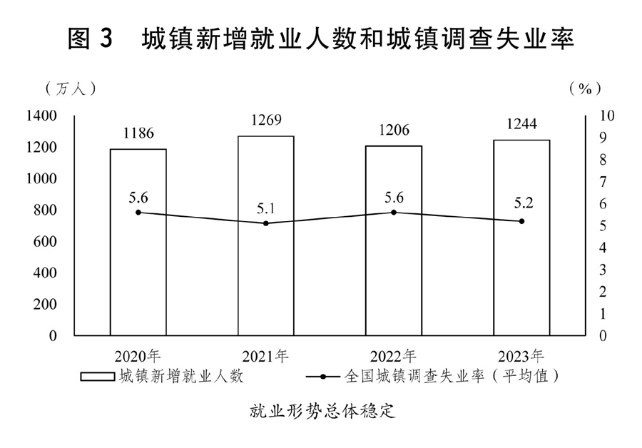 ——城鎮新增就業1200萬人以上,全國城鎮調查失業率5.5%左右。關于城鎮新增就業:主要考慮是,2024年新成長勞動力規模仍然較大,農村勞動力轉移等就業結構調整也需要新的就業崗位,城鎮新增就業目標由2023年的“1200萬人左右”調整為2024年的“1200萬人以上”,既是穩就業、調結構、增信心的客觀要求,又體現了穩就業工作的力度和決心。關于城鎮調查失業率:主要考慮是,在2024年經濟運行風險挑戰增多、重點人群就業壓力較大的情況下,將預期目標穩定在5.5%左右,體現了就業優先的政策導向。