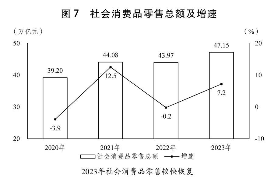 一是消費潛力進一步釋放。出臺實施恢復和擴大消費的20條政策措施。穩定和擴大汽車、家居、電子產品等重點消費,延續和優化新能源汽車車輛購置稅減免政策,加快推進充電基礎設施建設,全國充電基礎設施累計達859.6萬臺。加強消費者權益保護,持續優化消費環境。推動文化、旅游、餐飲等生活服務消費加快恢復,全年服務零售額增長20.0%,國內出游人次、居民出游花費分別增長93.3%和140.3%。全年社會消費品零售總額達到47.15萬億元,增長7.2%,其中,網上零售額達到15.43萬億元,增長11.0%。成功舉辦中國品牌日活動。開展“消費提振年”活動。加快國際消費中心城市培育建設。