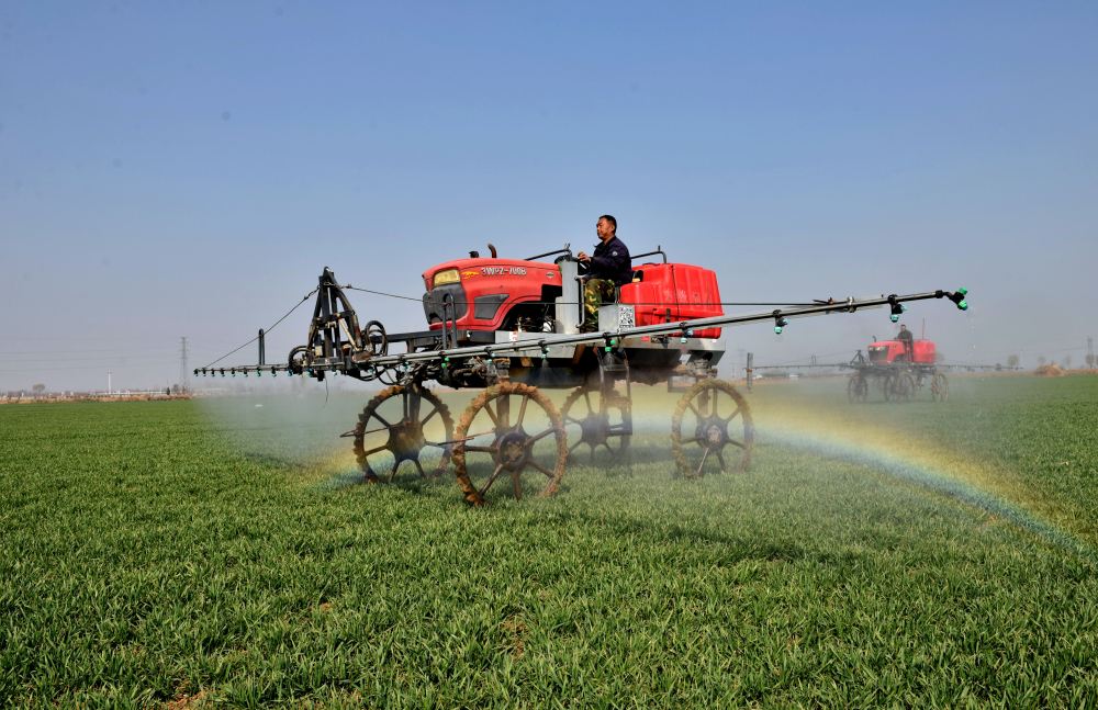 2024年3月12日,河北省邢臺市南和區史召鄉北高五村農民駕駛農機在麥田噴灑農藥。新華社記者 王曉 攝