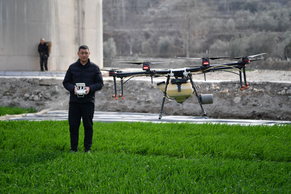 2024年3月9日,甘肅省隴南市武都區漢王鎮農業技術推廣站技術人員楊亮亮操作植保無人機給冬小麥施肥。新華社記者 陳斌 攝