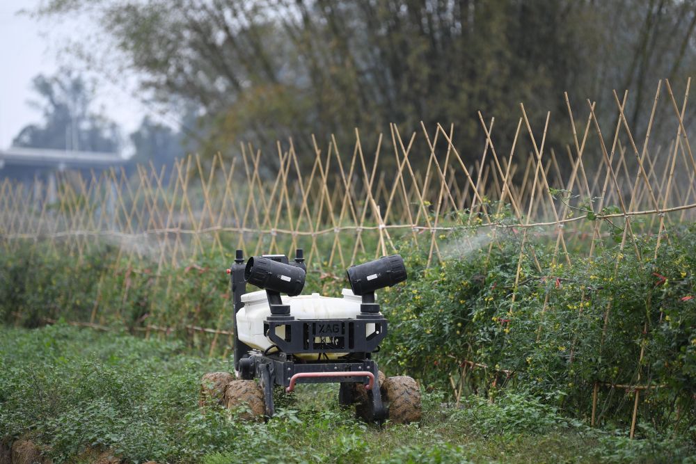 在廣州蓮塘村舉行的黃埔區春耕春播現場會上,一臺自行走農機在進行噴灑作業(2024年3月15日攝)。新華社記者 鄧華 攝