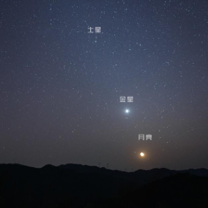 北京星空攝影愛好者王俊峰2023年1月23日在北京西城區拍攝的金星(左上)、土星(右下)和月亮。(本人供圖)