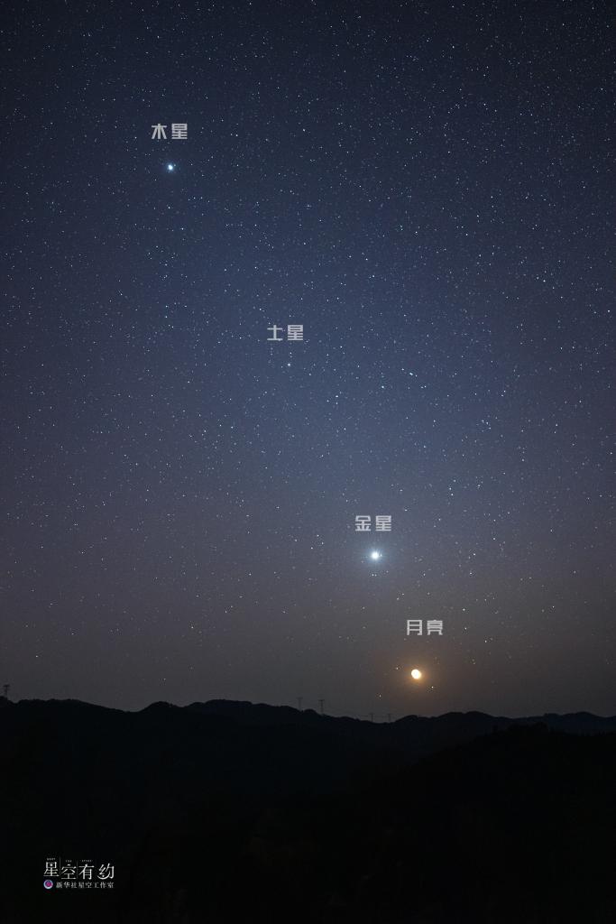 重慶星空攝影愛好者戴建峰2021年12月6日在貴州黔南布依族苗族自治州拍攝的木星、土星、金星和月亮。(本人供圖)