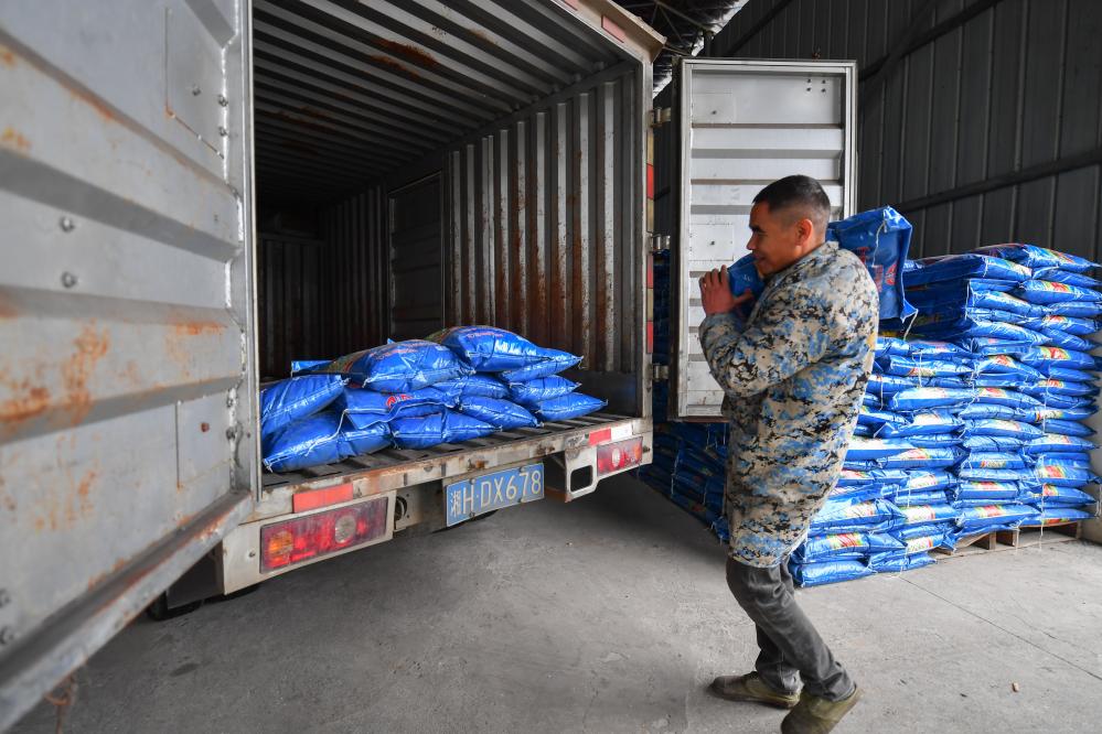 2月25日,在湖南省益陽市赫山區的農資連鎖配送中心,工作人員將農資搬運上車。新華社記者陳澤國 攝