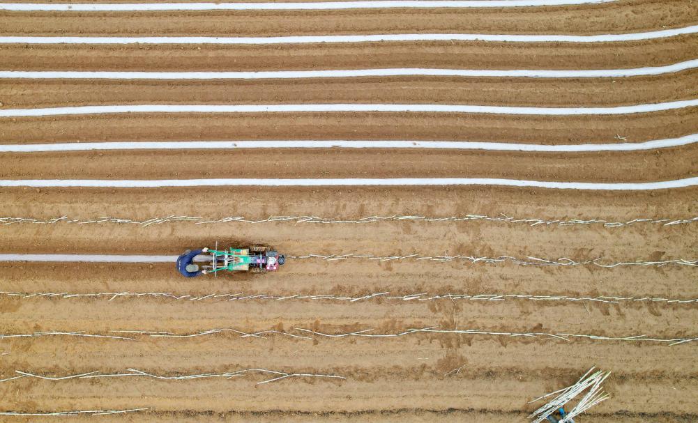在廣西柳州市融安縣大良鎮龍山村,一名農民駕駛農機為新種植的甘蔗蓋地膜。(譚克興 攝)