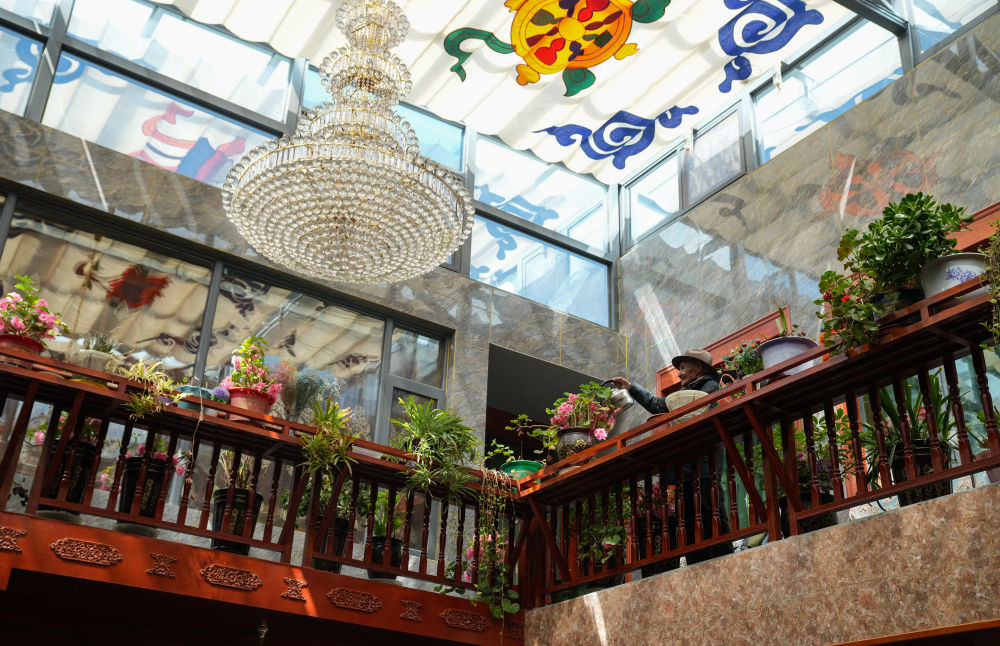 2024年3月14日,嘎東社區居民朗杰在自家二樓給花澆水。新華社記者 晉美多吉 攝