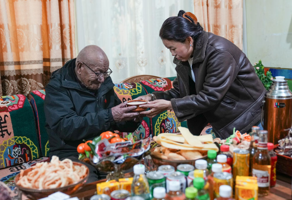 2024年3月14日,在位于嘎東社區的家中,兒媳普赤給益西桑珠(左)敬茶。新華社記者 晉美多吉 攝