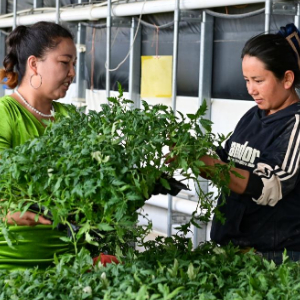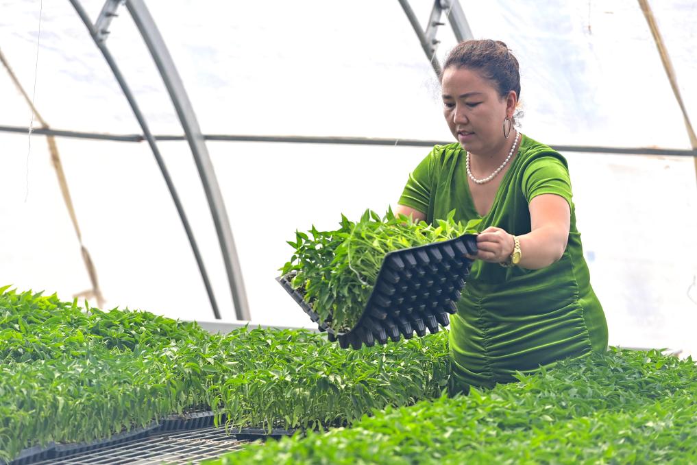 三月將盡,大漠乍暖還寒。坐落于戈壁灘邊緣的一座座溫室大棚內滿目翠綠、暖意融融,米哈熱古麗·艾合麥提在一盤盤秧苗間麻利穿梭,額頭上的汗珠不時滾落。