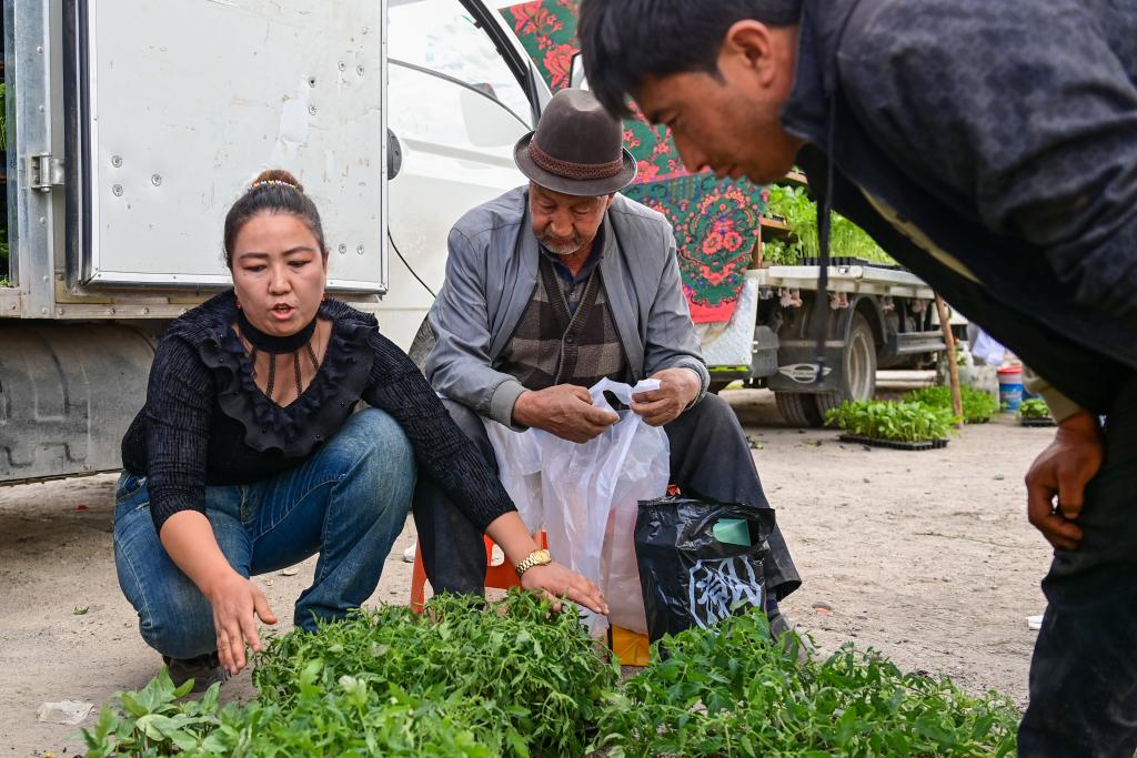 兩人你搬我裝,一會兒工夫,車廂貨架上便擺滿了育苗盤。第二天在巴扎上再見到她們時,菜苗已賣了大半?!败嚿?2000多棵苗子,已經賣了10000棵?!泵坠峁披惻d奮地告訴記者,看見合作伙伴掙錢,自己也跟著高興。