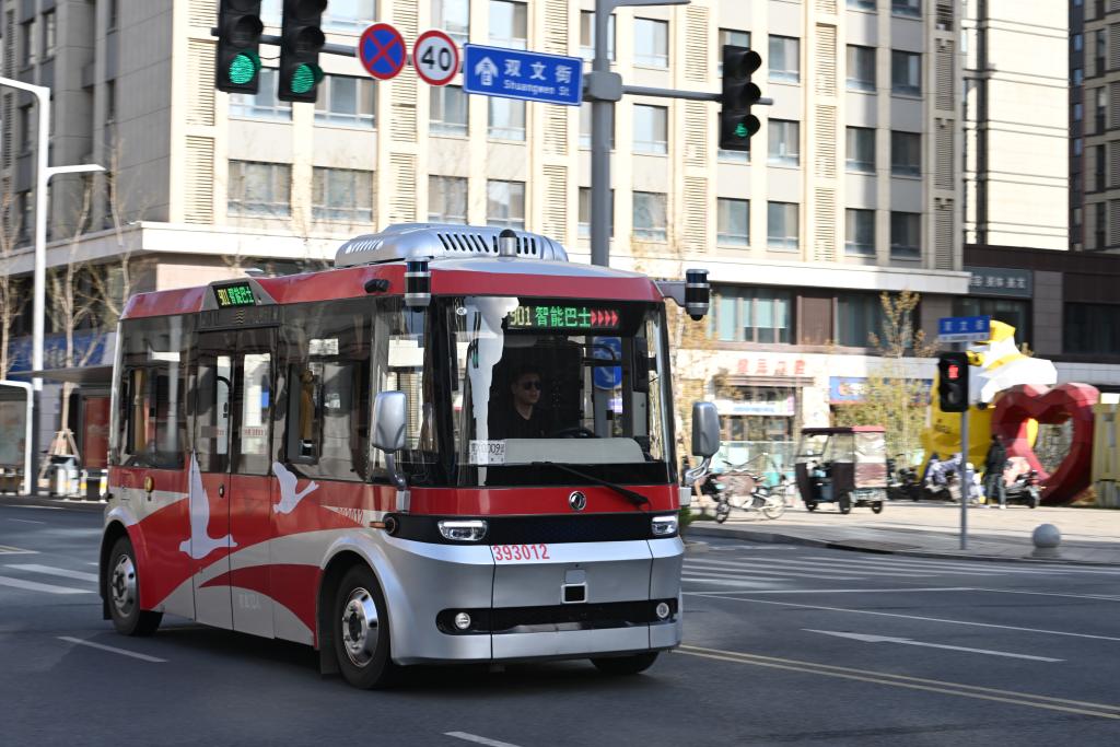 3月29日,無人駕駛智能網聯巴士在雄安新區容東片區道路上行駛。新華社記者 牟宇 攝