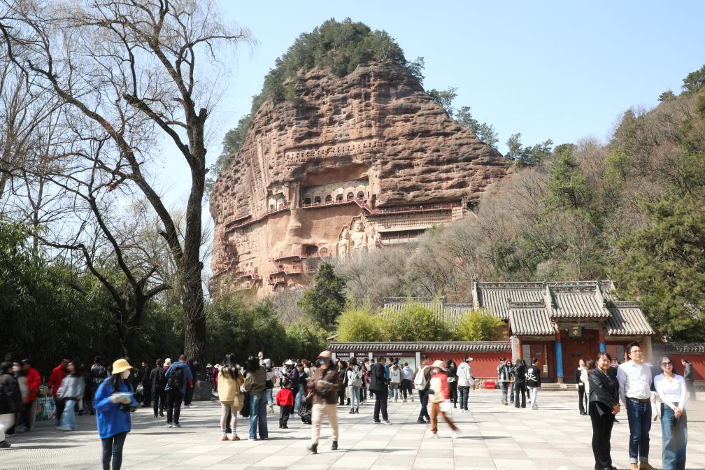 2024年3月20日,游客在天水市麥積區游覽麥積山石窟。新華社記者 馬希平 攝