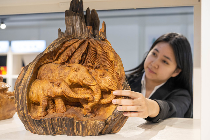 在伊春森工電子商務產業園,工作人員擺放木雕擺件(3月12日攝)。除署名外組圖均由新華每日電訊記者 謝劍飛 攝