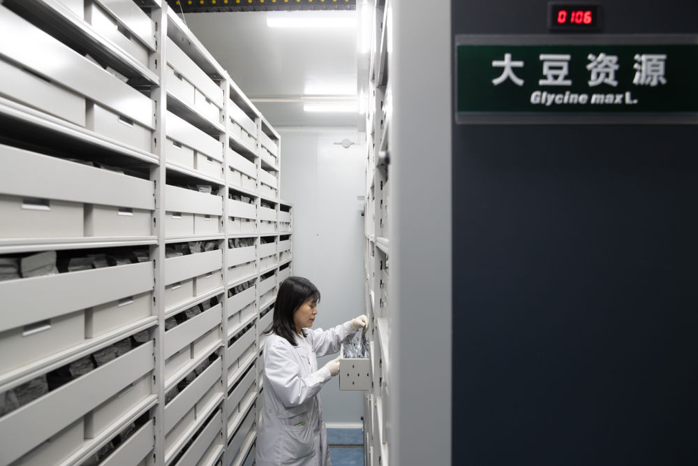 2024年4月2日,工作人員在國家寒帶作物及大豆種質資源中期庫(哈爾濱)內查看大豆種質情況。新華社記者 張濤 攝