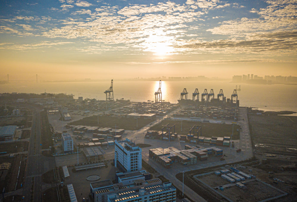 在海南自貿港重點園區——洋浦經濟開發區拍攝的洋浦國際集裝箱碼頭(2024年1月1日攝,無人機照片)。新華社記者 蒲曉旭 攝