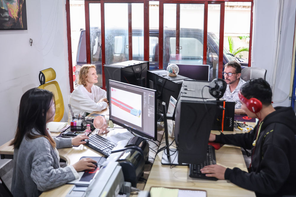 外籍人士和其他員工在位于海南博鰲的沖浪用品店工作(2024年3月7日攝)。新華社記者 張麗蕓 攝