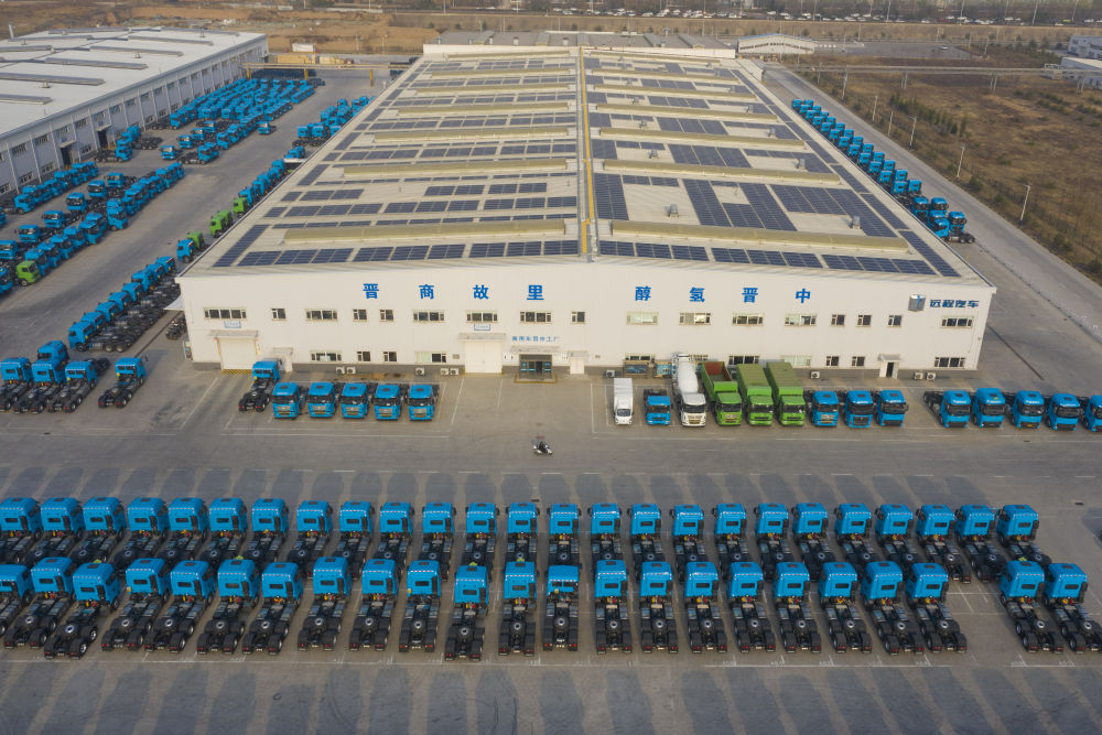 這是在位于山西省晉中市榆次區的山西新能源汽車工業有限公司(吉利晉中基地)拍攝的甲醇重卡(4月1日攝,無人機照片)。新華社記者 楊晨光 攝