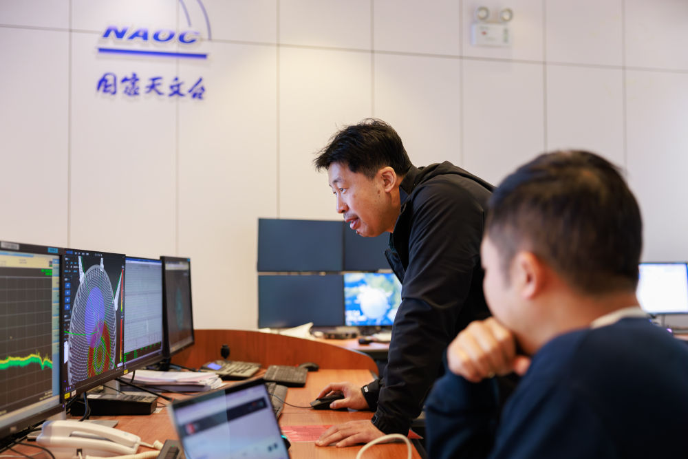 FAST運行和發展中心常務副主任、總工程師姜鵬(左)在總控室內觀察設備運行狀況(2024年3月20日攝)。新華社記者 劉續 攝
