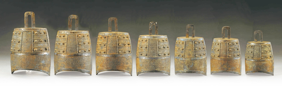 武王墩一號墓出土的銅編鐘?;茨鲜胁┪镳^供圖