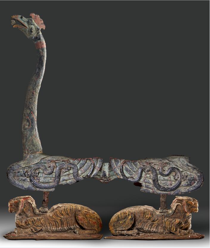 武王墩一號墓出土的鳳鳥虎座鼓架?;茨鲜胁┪镳^供圖