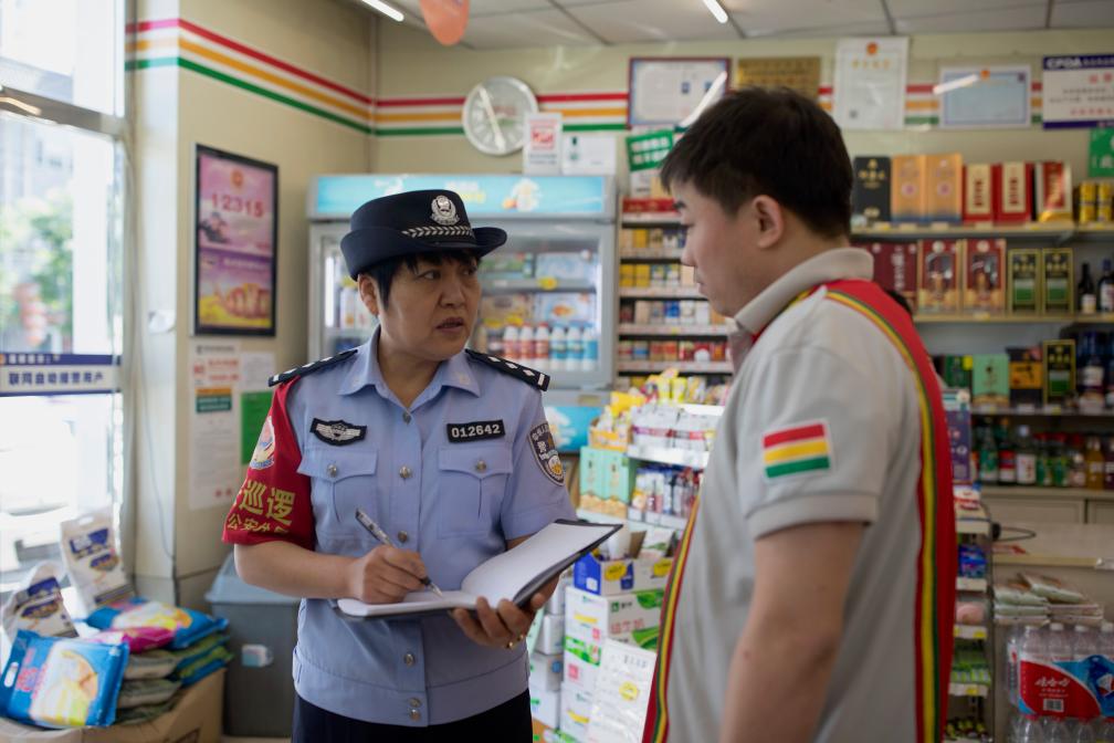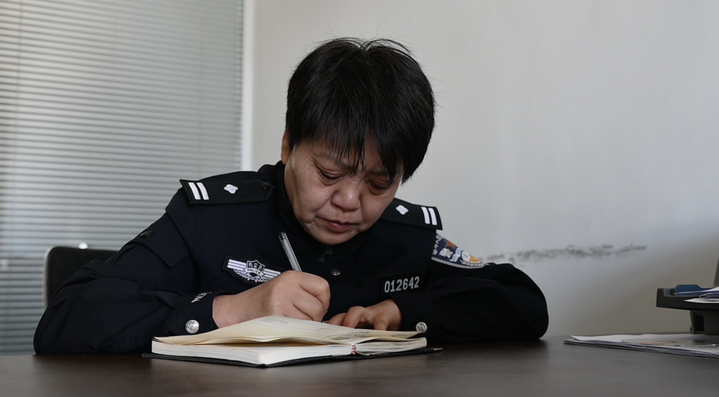 4月2日,民警索連紅在小召前街派出所的辦公室內記工作筆記。