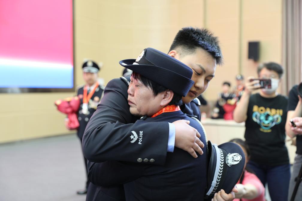 4月26日,民警包牧仁在警號傳承儀式上擁抱母親索連紅。