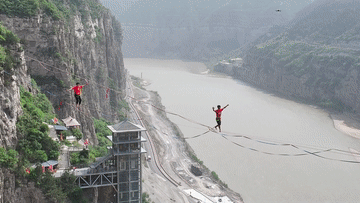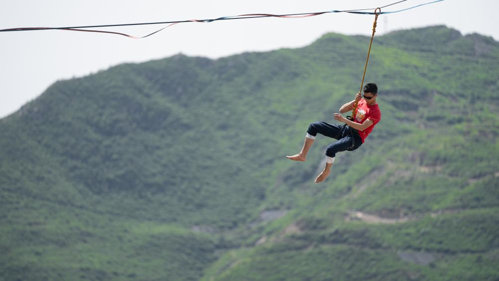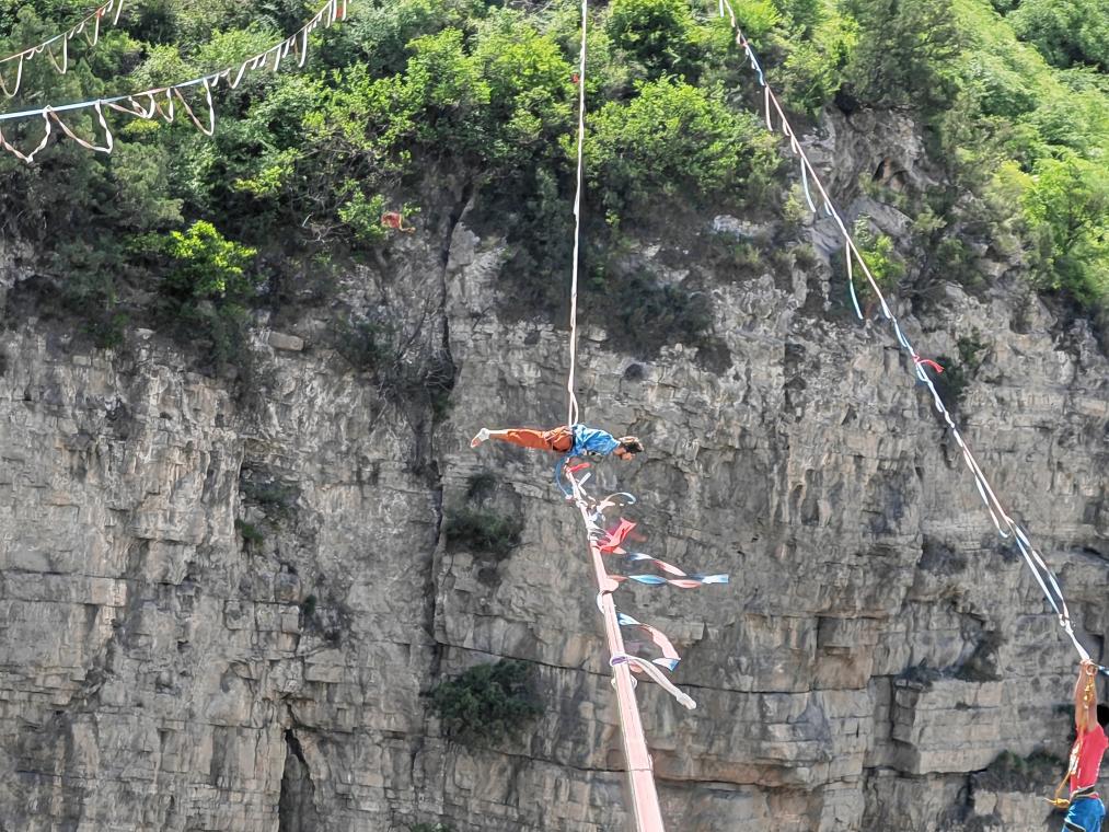 國際高空扁帶挑戰賽在山西省河津市的黃河大梯子崖景區開賽。蘭立強 攝