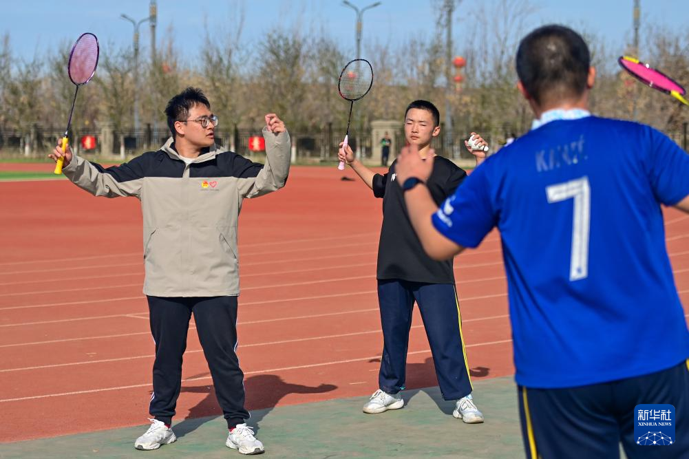 在新疆雙河市高級中學,第25屆支教團成員閆睿篪(左一)給同學們上羽毛球選修課(4月11日攝)。新華社記者 丁磊 攝