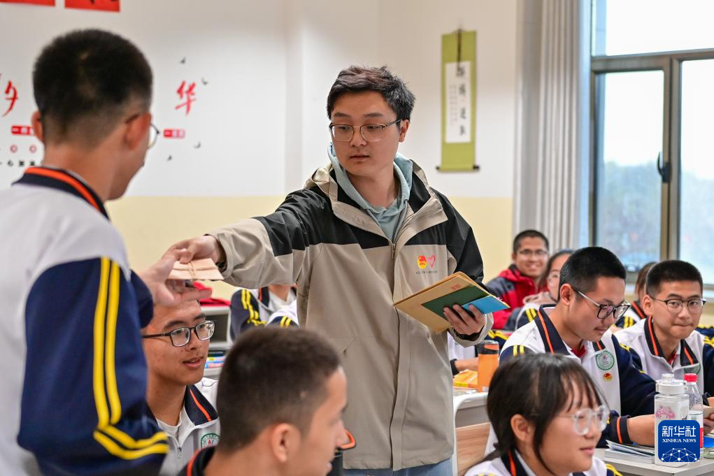 在新疆雙河市高級中學,第25屆支教團成員王仡柯為同學分發回信(4月12日攝)。新華社記者 丁磊 攝