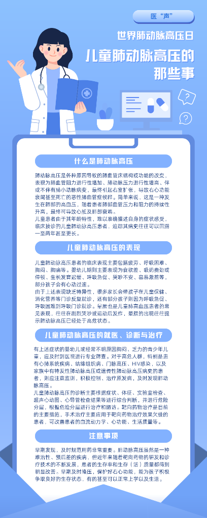 今年的5月5日是第13個世界肺動脈高壓日。肺動脈高壓患者由于缺氧導致嘴唇呈現藍紫色,這是其典型表現。但肺動脈高壓兒童患者往往臨床表現不典型,且兒童難以準確描述自身的癥狀感受,導致早期難以被診斷,未經規范治療的兒童肺動脈高壓患者,平均生存期僅10個月。專家呼吁,家長應對孩子身體的異常信號提高警惕,及時就醫。