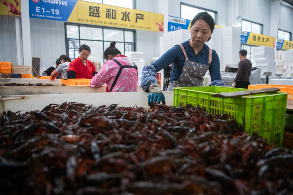 2024年4月30日,在位于湖北省潛江市的中國小龍蝦交易中心,工作人員分揀小龍蝦。新華社記者 伍志尊 攝