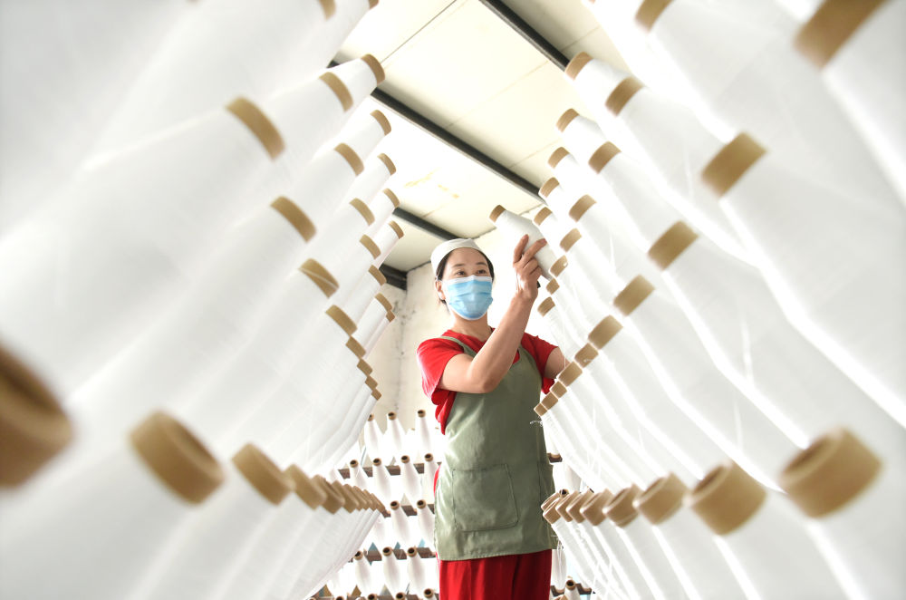 2024年5月1日,工人在山東省淄博市沂源縣悅莊工業園一玻纖企業整理加工的產品。新華社發(趙東山攝)