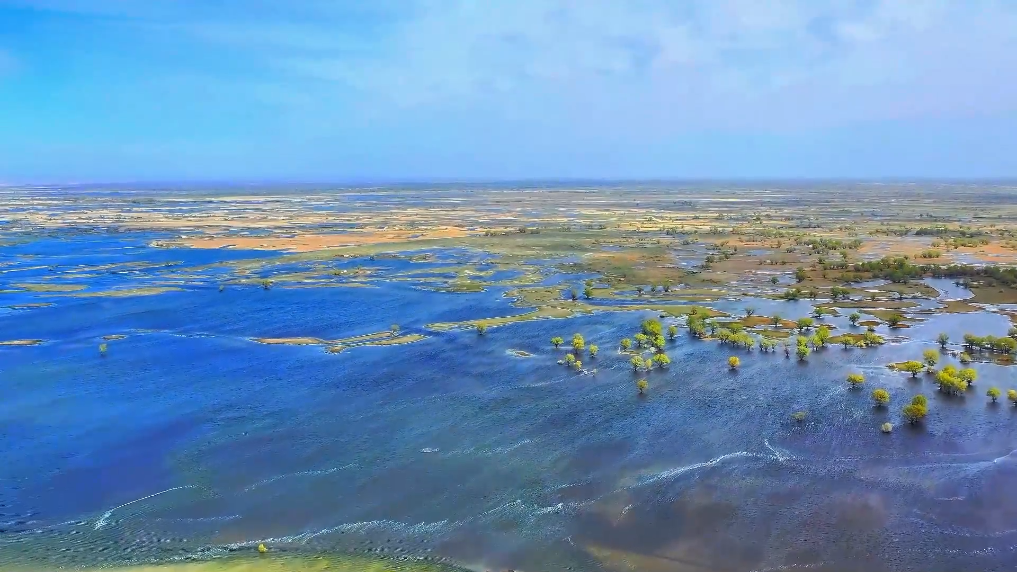 5月,新疆阿勒泰市科克蘇濕地國家級自然保護區,河水穿過草甸,候鳥在水中嬉戲覓食,一派生機盎然的景象。
