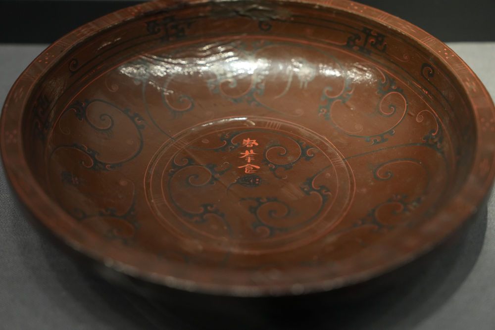 這是2024年5月13日在湖南博物院長沙馬王堆漢墓陳列展廳拍攝的“君幸食”貍貓紋漆食盤。新華社記者 薛宇舸 攝