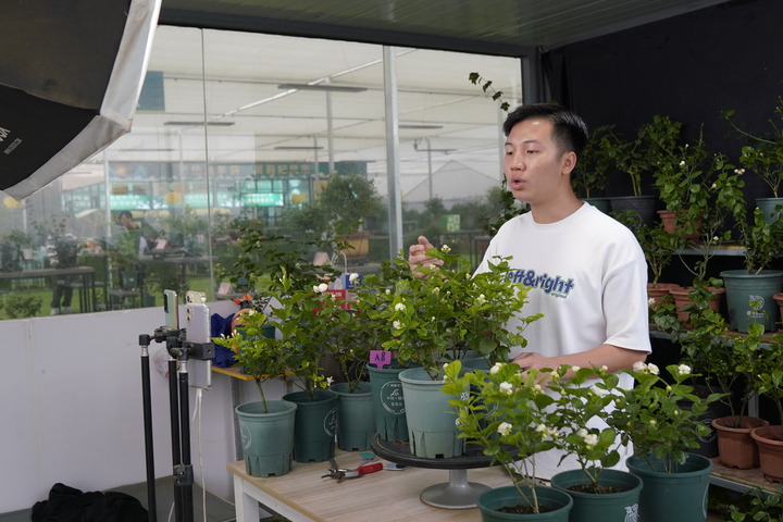 橫州年輕人通過直播帶貨、網店等形式向外銷售茉莉花盆栽。新華社記者 趙歡 攝
