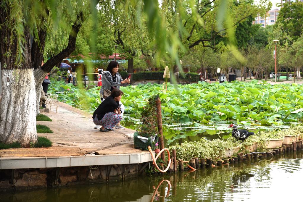 5月20日,游人在翠湖公園與湖中動物互動。新華社記者 陸君鈺 攝