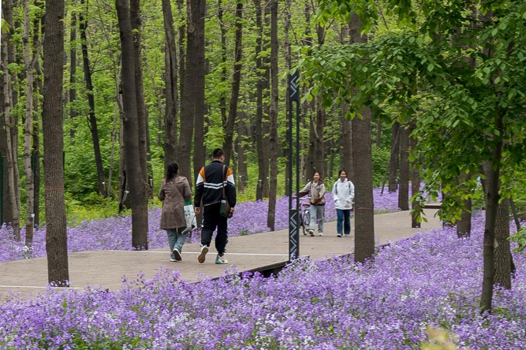 市民、學生在東北林業大學城市林業示范基地內散步(5月11日攝)。(李俊達 攝)