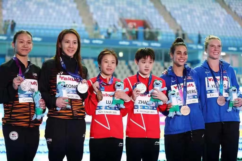2019年光州游泳世錦賽,梁敏儀(左二)和搭檔獲得女子雙人10米臺銀牌,冠軍為中國組合盧為和張家齊(圖中)