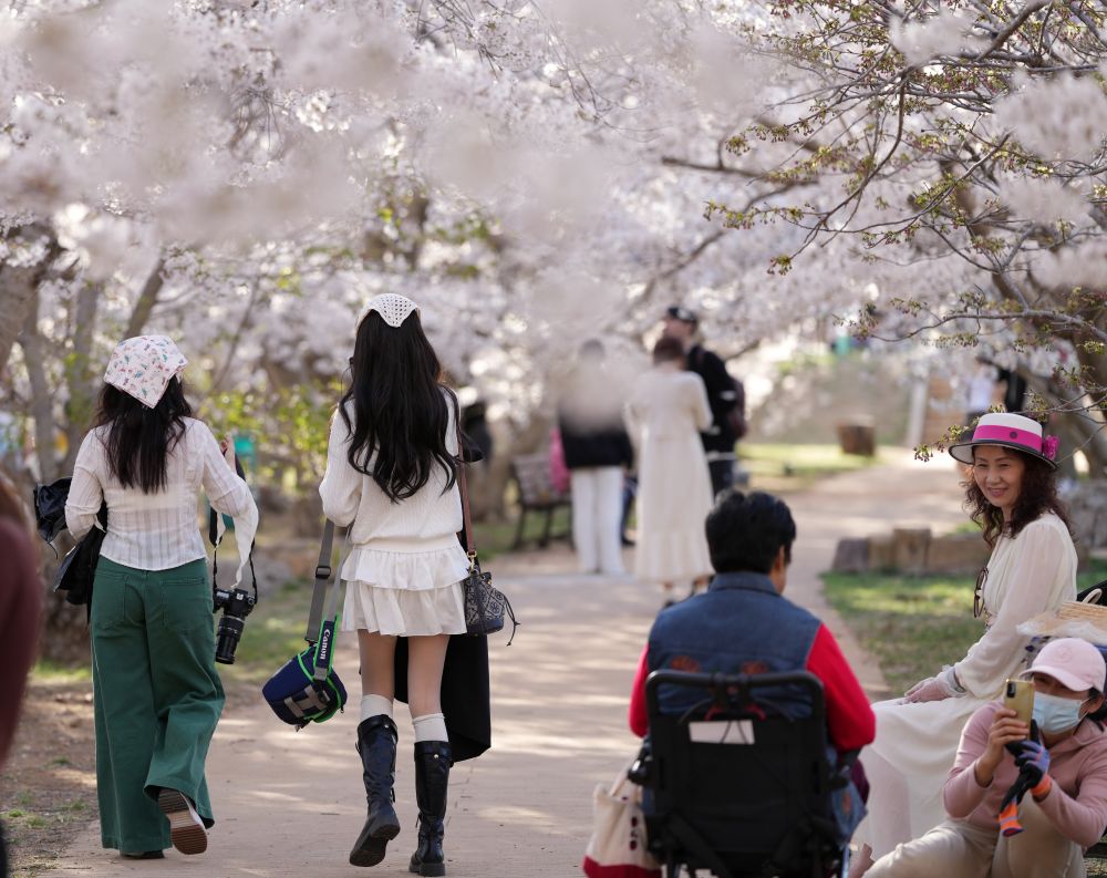 2024年4月17日,游客在遼寧省大連市龍王塘櫻花園內賞花、游覽。新華社記者 李鋼 攝