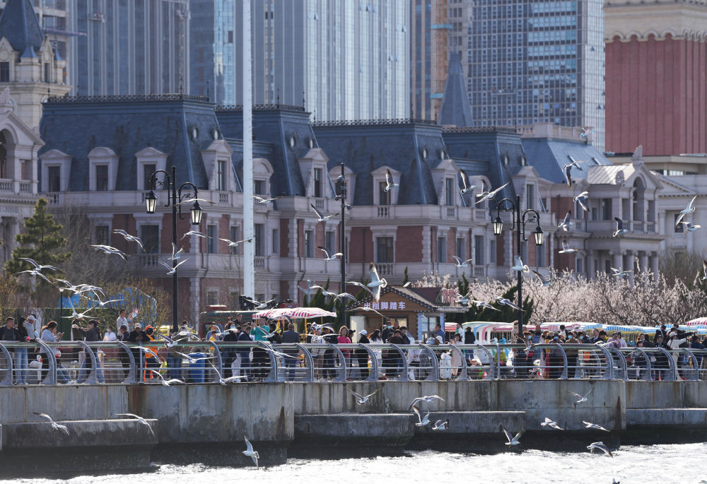 2024年4月16日,在遼寧省大連市東港商務區,游客在海邊休閑觀光。新華社記者 李鋼 攝