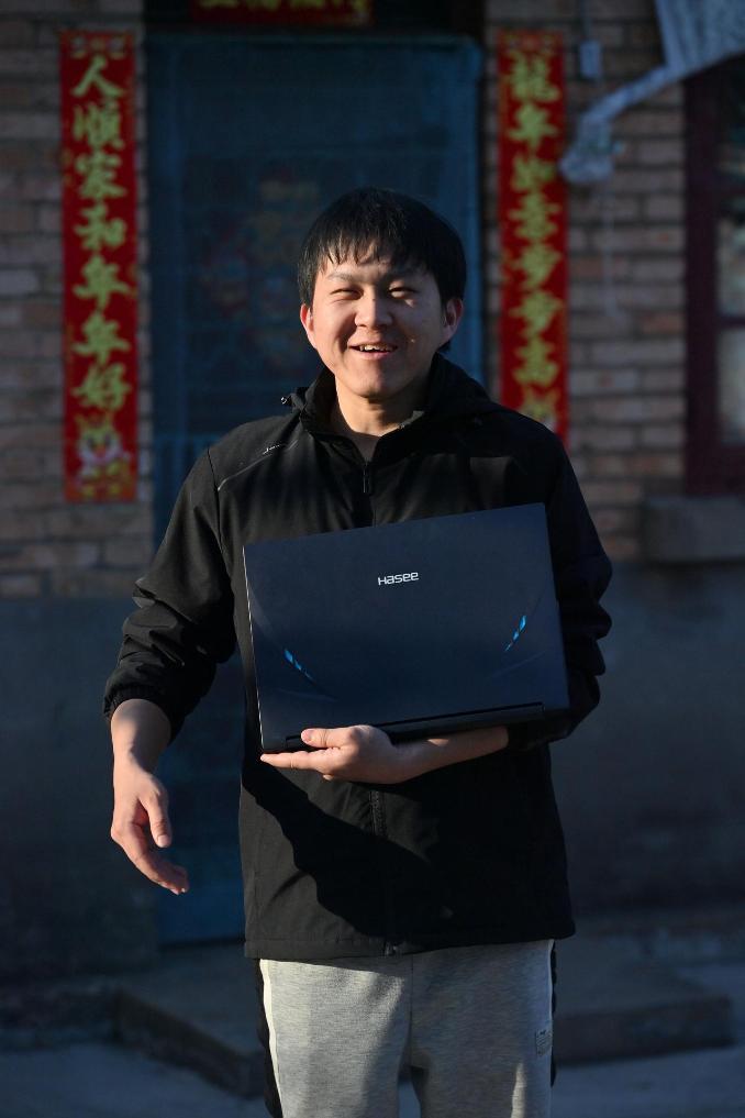 在柳州市鷓鴣江路附近一處出租屋外,熊三耶在展示剛剛購買的筆記本電腦(2024年2月11日攝)。新華社記者黃孝邦攝