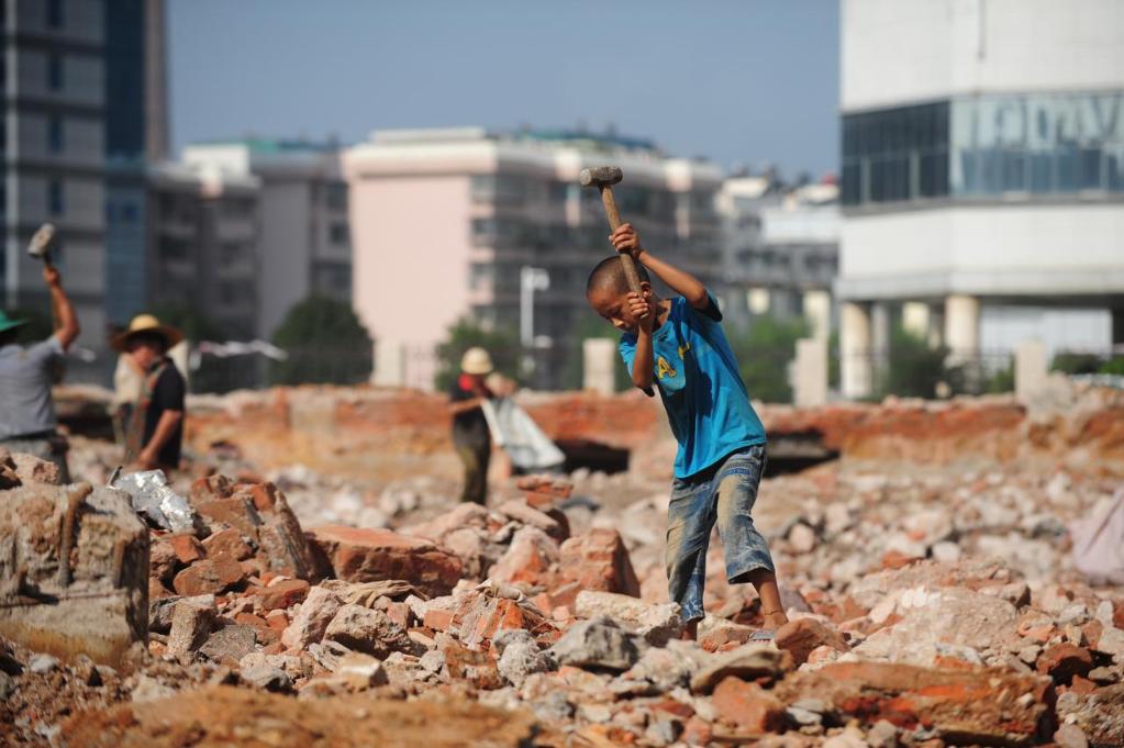 在柳州市北雀路一處工地,熊三耶和伙伴們在打鐵(2013年8月29日攝)。新華社記者黃孝邦攝