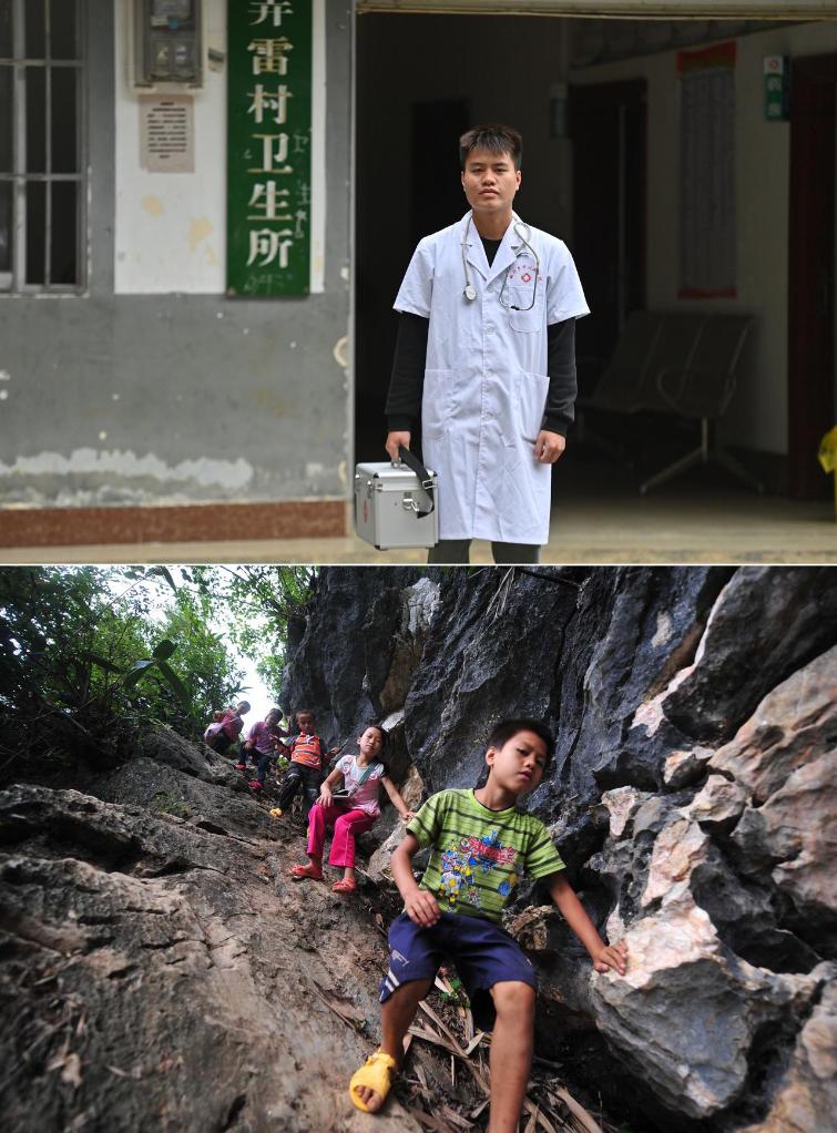 拼版照片:上圖為2023年5月24日,村醫蒙富松站在大化縣板升鄉弄雷村衛生所前。新華社記者胡星宇攝。下圖為2012年9月5日,10歲的蒙富松(右一)爬懸崖去學校讀書。新華社記者黃孝邦攝