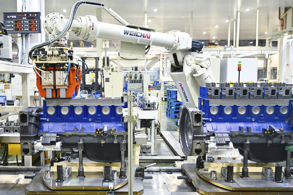 2023年11月30日,在濰柴動力股份有限公司總裝生產線,機器人在裝配清潔能源發動機。新華社發(孫國祥 攝)