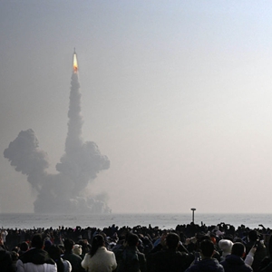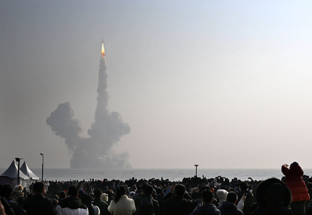 2024年1月11日,人們在山東省海陽市連理島上觀看海上火箭發射。新華社記者 李紫恒 攝