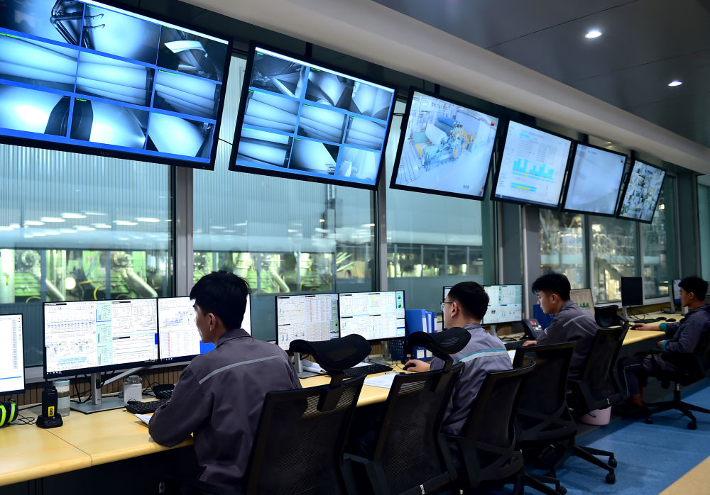2023年10月25日,在亞太森博(山東)漿紙有限公司監控室,工作人員監看生產車間運行情況。新華社記者 張善臣 攝