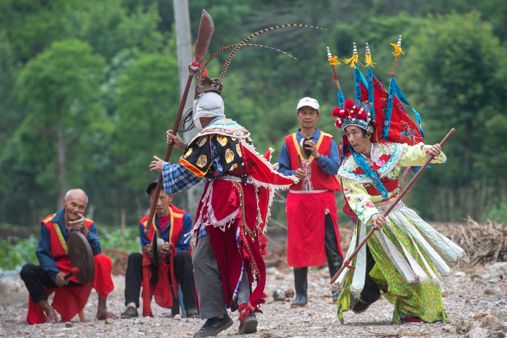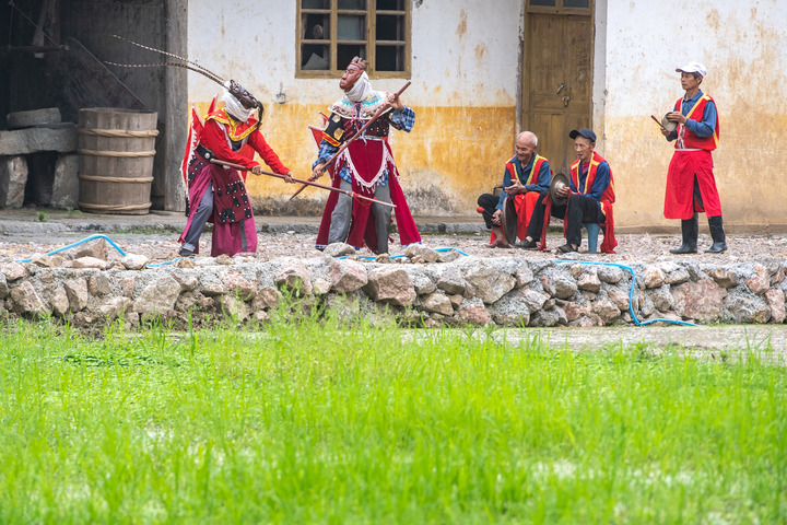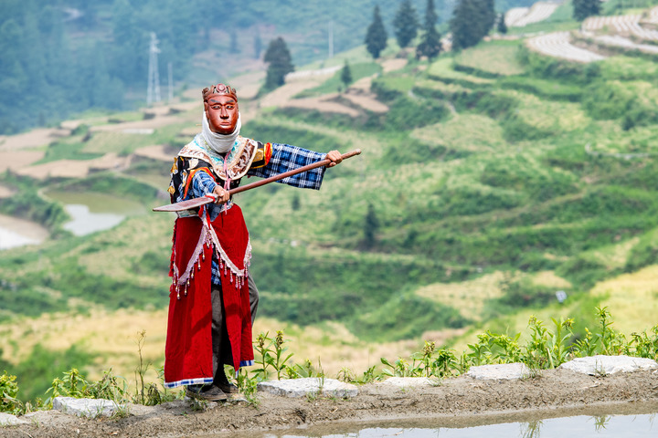 又是一年武陵山間水稻插秧季。在重慶市酉陽土家族苗族自治縣銅鼓鎮清泉村,水稻田間時時回響著極具地方特色的戲曲唱段,一群特別的非遺技藝陽戲(酉陽土家面具陽戲)表演者,往來于田間地頭。他們忙時翻土培秧,準備著水稻插秧,閑時則舞槍弄劍,排演著表演劇目。