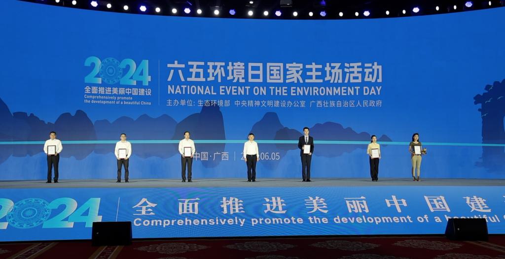 6月5日,在2024年六五環境日國家主場活動現場,生態環境部公布了2024年度生態環境特邀觀察員名單。生態環境部部長黃潤秋向生態環境特邀觀察員頒授聘書。新華社記者梁舜攝