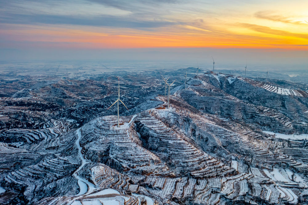 這是在山西省運城市萬榮縣境內拍攝的風力發電機組(無人機照片,2024年1月24日攝)。新華社發(閆鑫 攝)