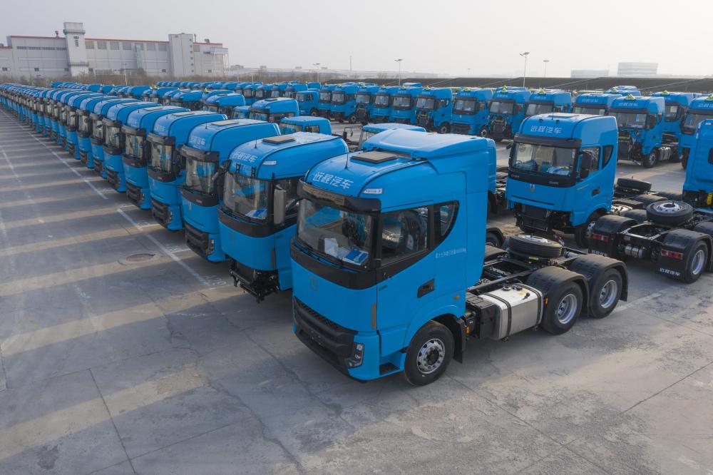 這是2024年4月1日在位于山西省晉中市榆次區的山西新能源汽車工業有限公司(吉利晉中基地)拍攝的甲醇重卡(無人機照片)。新華社記者 楊晨光 攝