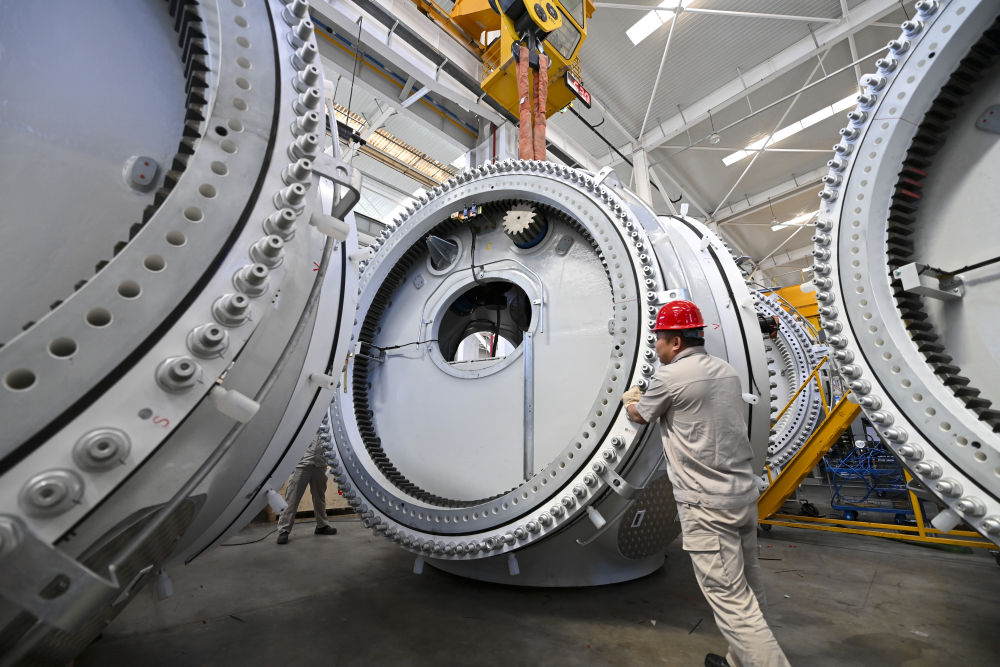 工人在位于山西轉型綜合改革示范區的太重集團新能源產業園區吊運風電裝備(2024年5月30日攝)。新華社記者 楊晨光 攝